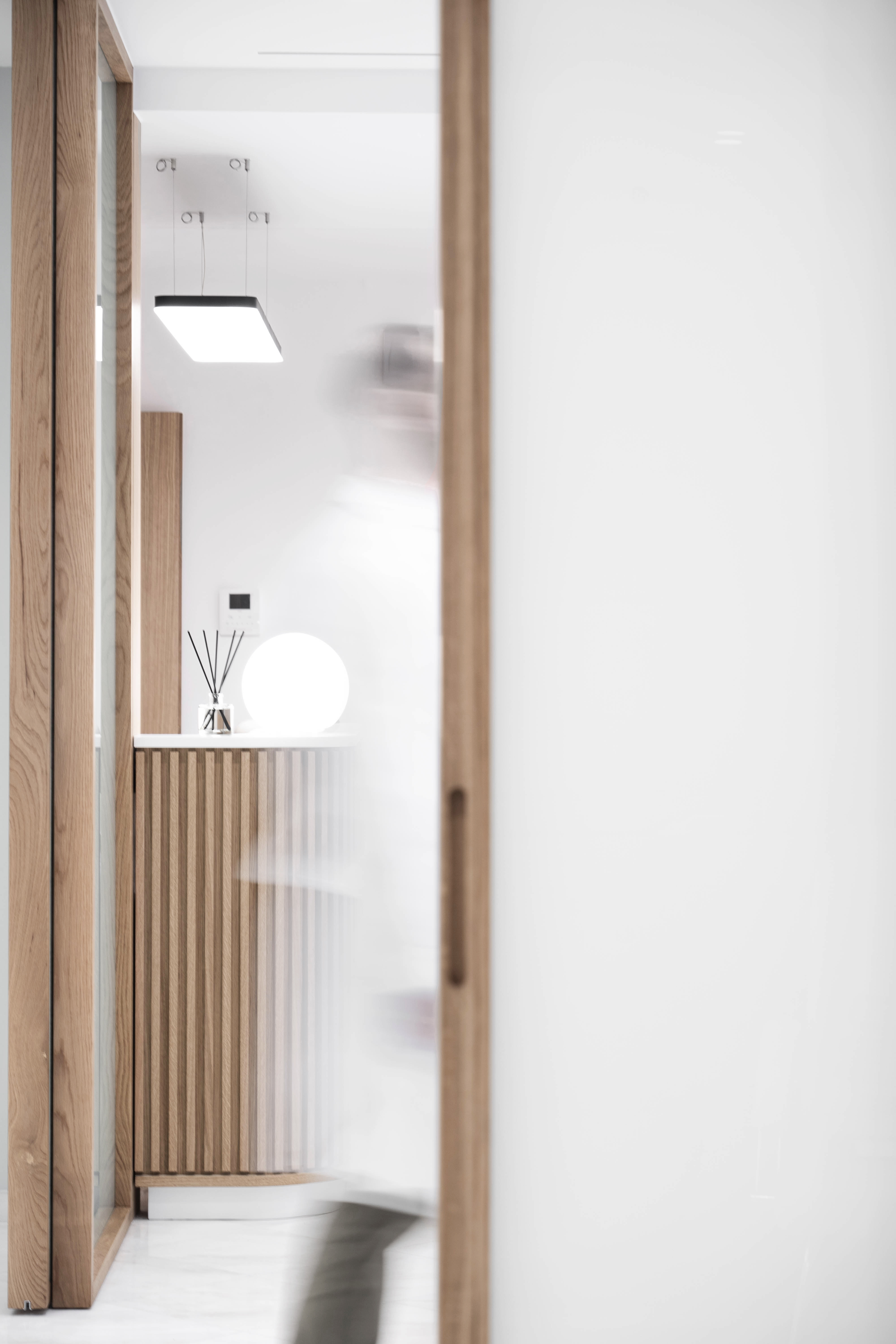 The continuous alternation of the oak element with the white color exudes a sense of calmness and purity in the space, giving a minimalist but at the same time imposing identity.