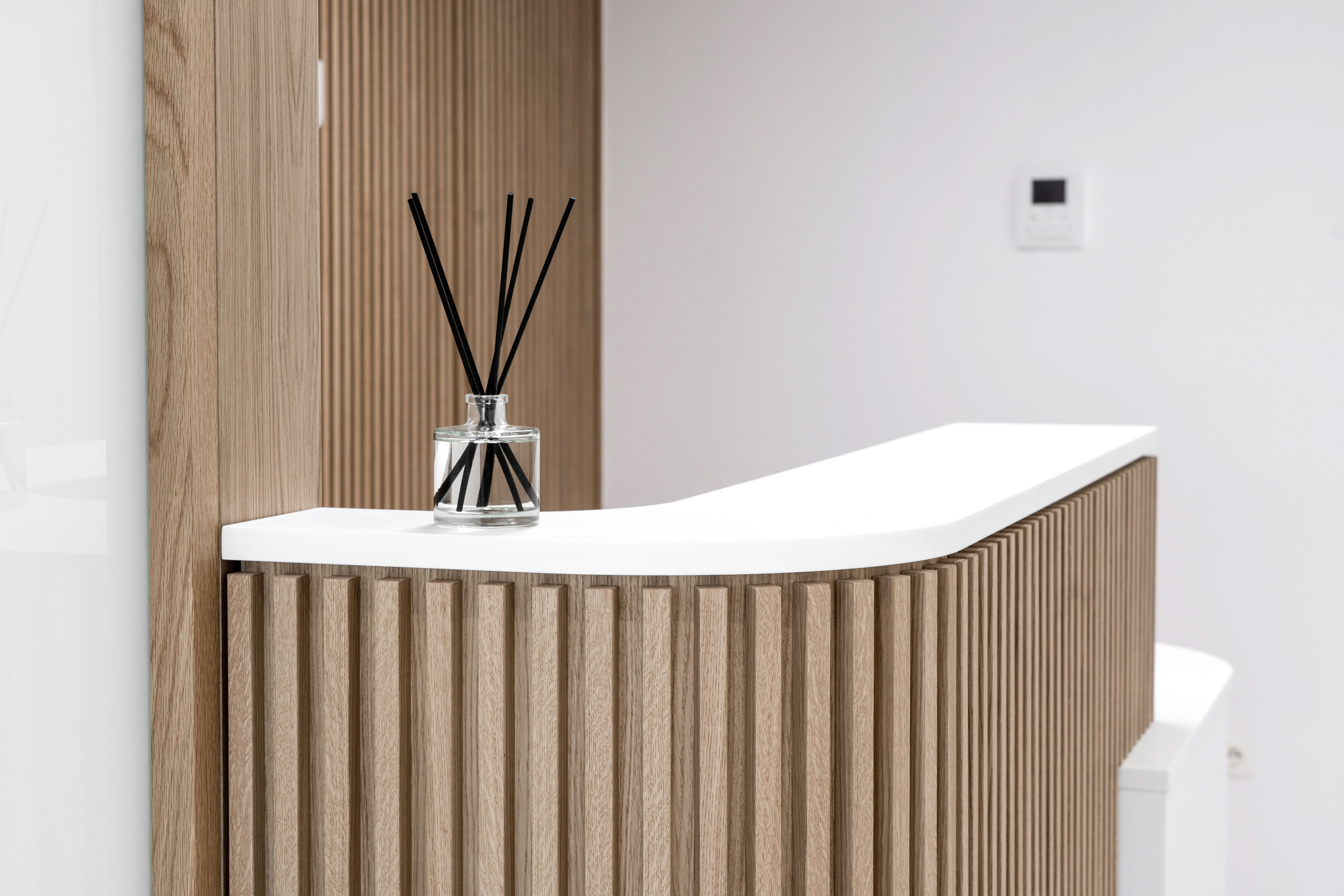 At the entrance, the light oak wood narrative begins and it is used throughout the entire project. The Reception Desk where the element of the curve prevails strongly, embracing the visitor in an attempt to integrate smoothly into the space, while a hidden door integrated into the wooden wall paneling consisting of vertical solid wood slats ensures the provision of privacy in the ancillary areas of the Clinic.